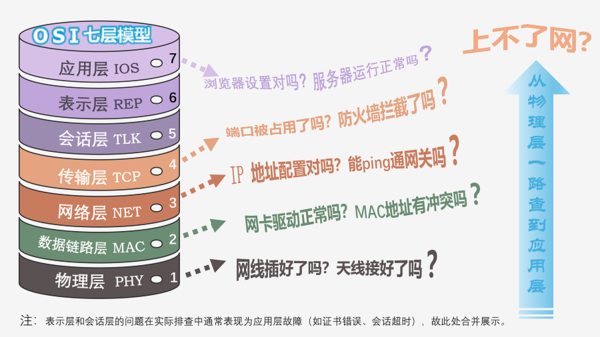 ✅故障排查指南:分层定位问题,是网络排错的基本方法论:上不了网?从物理层一路查到应用层,每一层只关注自己的问题,让复杂的故障排查变得清晰有序。