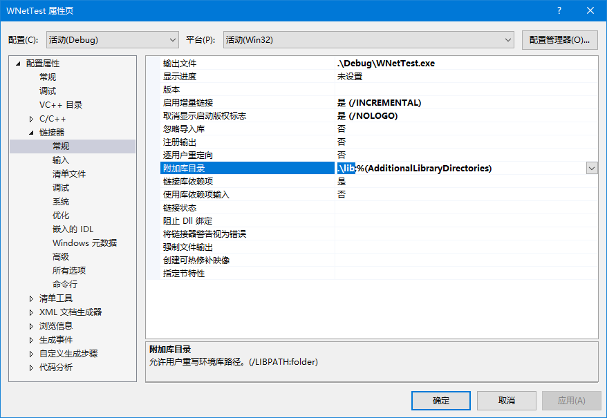 将lib文件的路径“W:WNetTestlib”加入工程的库文件路径中