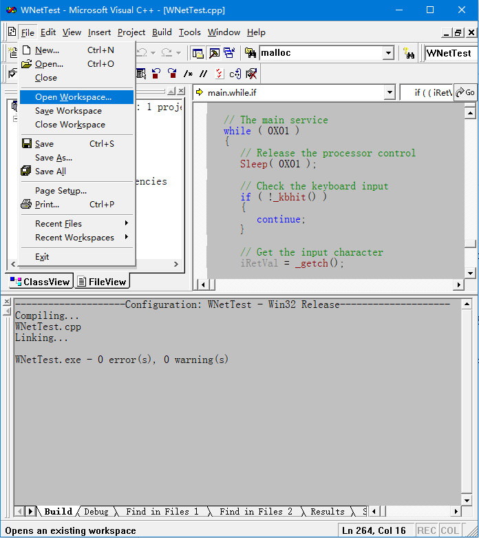 1. 先启动Microsoft Visual Studio 6.0,然后从菜单“File”中选择“Open Workspace”打开工程。