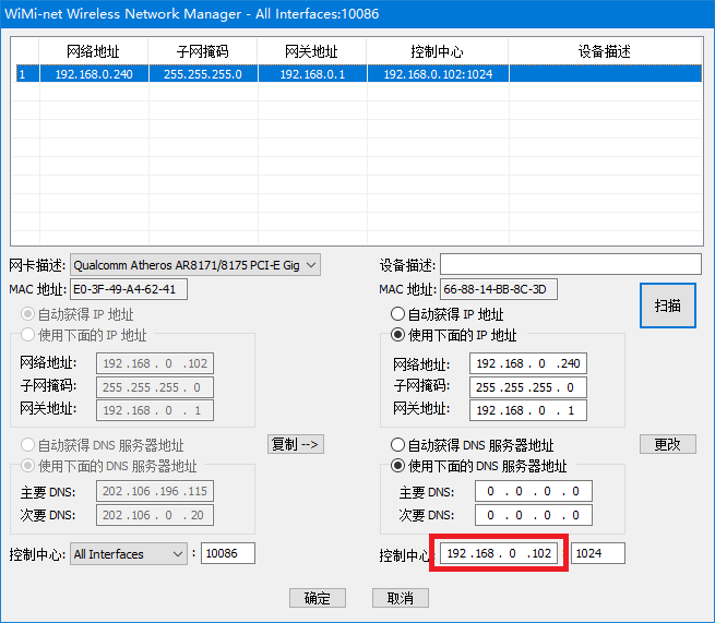 | 参数一 | char * pDevice | 目标设备的通讯端口名称,以字符串形式输入,分为串口和网口两种接口端口类型,共计三种模式: 串口通讯,就用“COM1”,“COM2”等名称,不区分大小写,也成“com1”,“”“com2”等也可以。 网口通讯,基站作为 TCP Server,填写基站的IP地址,比如 “192.168.0.240”,见下图中“TCP Server模式”红色框住的部分。 网口通讯,基站作为 TCP Client,填写运行当前目标程序的PC或者云服务器的IP地址,比如PC或者云服务器的IP地址,同时需要确保基站配置软件中控制中心的IP地址需要填写为该地址,见下图中“TCP Client模式”红色框住的部分